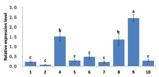 Expression level of AhSPC in transgenic Arabidopsis plants. 1–2 and 4–10 are plant serial numbers. T2 seedlings marked with different lowercase letters indicate statistically significant differences in expression levels (p < 0.01). Error bars indicate SD.