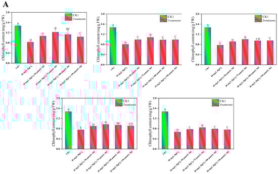 To investigate the physiological mechanisms by which MJ application enhances maize seedling growth under Hg stress, an L25 (25) orthogonal experiment was conducted. The variables included HgCl2 concentrations (30–50 mg/L), MJ concentrations (50–150 µmol/L), and a CK. The levels of proline, malondialdehyde (MDA), and chlorophyll, and the root vitality of the maize seedlings under various treatment conditions were measured (Table S1). The findings indicated that compared to the CK, different concentrations of Hg stress for 96 h notably decreased the chlorophyll levels in maize seedlings by 43.79%, 45.43%, 47.42%, 48.88%, and 54.75%, respectively (Figure 2A). In contrast, Hg stress significantly increased the MDA content in maize seedlings by 116.34%, 129.09%, 151.26%, 168.85%, and 179.33%, respectively (Figure 2B). Compared to the CK group, different concentrations of Hg stress increased the proline content in maize seedlings by 6.56%, 6.81%, 30.26%, 159.09%, and 103.77%, respectively (Figure 2C). However, these varying concentrations of Hg stress decreased the root vitality of maize seedlings by 22.49%, 52.21%, 53.45%, 54.85%, and 57.26%, respectively, compared to CK seedlings (Figure 2D). The exogenous application of different concentrations of MJ significantly increased the chlorophyll, proline, and root vitality of maize seedlings under Hg stress, while reducing the MDA content. Notably, the treatment with 75 μmol/L MJ exhibited the most pronounced effects. Under 45 mg/L HgCl2 stress, treatment with 75 μmol/L MJ led to a 28.67% increase in chlorophyll content, a 22.83% decrease in MDA content, a 42.98% increase in proline content, and a 34.94% increase in root vitality (Figure 2). However, exogenous MeJA treatment had no significant effect on the concentrations of proline, MDA, chlorophyll, or root vitality of maize seedlings under normal growth conditions (Figure S1B–E). These results indicate that this concentration of MJ significantly alleviated mercury toxicity in maize seedlings. Based on the results of orthogonal experiments, the effect of MJ on enhancing Hg tolerance in maize seedlings was further investigated using the combination of 45 mg/L HgCl2 and 75 μmol/L MJ.