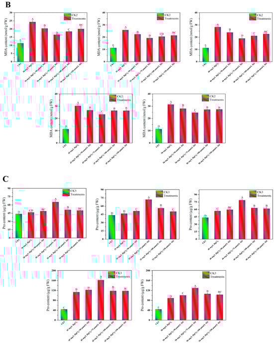 Epicotyl samples (0.2 g) of maize seedlings of uniform size were weighed and placed in 2 mL centrifuge tubes. The samples were then ground on ice, and the contents of chlorophyll, proline, MDA, and root activity of the maize seedlings were determined using plant chlorophyll content assay kits (chlorophyll was extracted with acetone and determined by spectrophotometry), proline (PRO) content assay kits (proline content was measured using the acid ninhydrin method), MDA content assay kits (MDA was determined by the thiobarbituric acid reaction), and plant root activity test kits (plant root activity was assayed by triphenyltetrazole chloride method) according to manufacturer’s recommendations, respectively. All kits were bought from Grace Biotechnology (Jiangsu Grace Biotechnology Co., Ltd., Suzhou, China; https://www.geruisi-bio.com/, accessed on 16 February 2024). Chlorophyll, proline, MDA, and root activity units were mg/g FW, μg/g FW, nmol/g FW, and μg formazan/h/g FW, respectively. Every experiment included three biological replicates and was carried out a minimum of three times. At least nine samples were collected at each treatment time point.