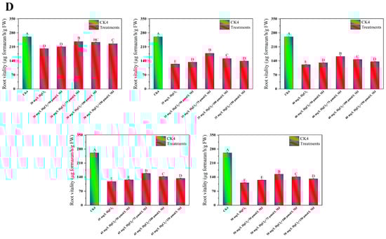 Exogenous MJ’s effects on the physiological traits of maize seedlings during Hg stress. (A) Effects of various concentrations of MJ on chlorophyll content in maize seedlings under different levels of Hg Stress, (B) Effects of various concentrations of MJ on MDA content in maize seedlings under different levels of Hg Stress, (C) Effects of various concentrations of MJ on proline (Pro) content in maize seedlings under different levels of Hg Stress, (D) Effects of various concentrations of MJ on root vitality in maize seedlings under different levels of Hg Stress. Significant differences between treatments at p < 0.01 are indicated by different capital letters in the figures.