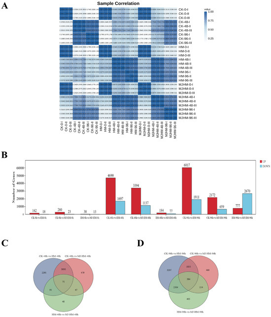 Analysis of differentially expressed genes (DEGs) in maize seedlings under different treatments. (A) Pearson correlation analysis shows the existence of a correlation between biological replicates, and the correlation coefficient R is shown on the heat map. (B) The histogram shows the quantities of DEGs that are either up-regulated (in red) or down-regulated (in blue) across various treatment groups. Venn diagrams show the variations in gene expression within the maize seedlings’ epicotyls at 48 h (C) and 96 h (D) in three treatments. CK (Control), HM (45 mg/L HgCl2), and HM-MJ (45 mg/L HgCl2+75 µmol/L MJ).