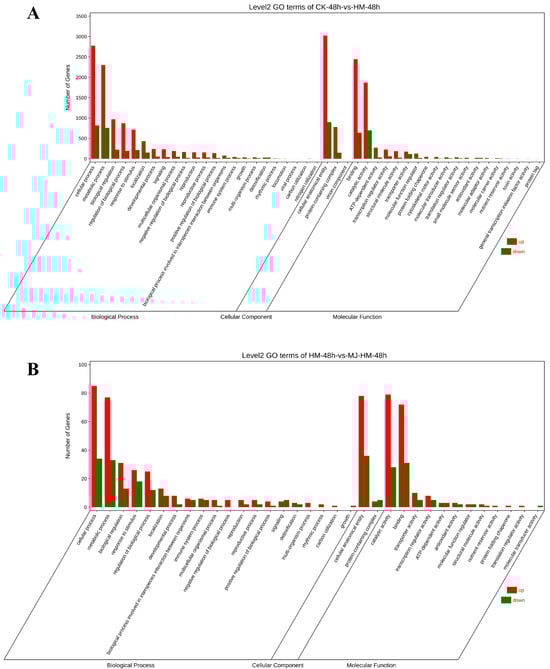 In order to ascertain how exogenous MJ affected Hg stress in maize seedlings, we screened for DEGs using a threshold of |log2 (fold change)| ≥ 1 and p < 0.05. In total, 20,770 DEGs were identified. After 48 h of treatment, we detected 6387 DEGs (4690 up-regulated and 1697 down-regulated) between CK-48 h and HM-48 h, 4531 DEGs (3394 up-regulated and 1137 down-regulated) between CK-48 h and MJ-HM-48 h, and 261 DEGs (184 up-regulated and 77 down-regulated) between HM-48 h and MJ-HM-48 h. After 96 h of treatment, we identified 7928 DEGs (6017 up-regulated and 1911 down-regulated) between CK-96 h and HM-96 h, 2831 DEGs (2172 up-regulated and 659 down-regulated) between CK-96 h and MJ-HM-96 h, and 3447 DEGs (777 up-regulated and 2670 down-regulated) between HM-96 h and MJ-HM-96 h (Figure 3B). The results indicated that MJ significantly influenced gene expression in maize seedlings under Hg stress, with a greater number of DEGs observed at 96 h than at 48 h. Furthermore, analysis of DEGs at 48 and 96 h using Venn diagrams identified 166 common genes through pairwise comparisons of CK-48 h vs. HM-48 h and HM-48 h vs. MJ-HM-48 h, whereas 2888 common DEGs were found in the comparisons of CK-96 h vs. HM-96 h and HM-96 h vs. MJ-HM-96 h. In the comparison of three different treatments (CK-48 h vs. HM-48 h, CK-48 h vs. MJ-HM-48 h, HM-48 h vs. MJ-HM-48 h; CK-96 h vs. HM-96 h, CK-96 h vs. MJ-HM-96 h, and HM-96 h vs. MJ-HM-96 h) at 48 and 96 h, 75 and 384 common DEGs were identified, respectively. This indicates that the MJ-induced regulation of gene expression under Hg stress plays a role in enhancing the Hg tolerance of maize seedlings (Figure 3C).