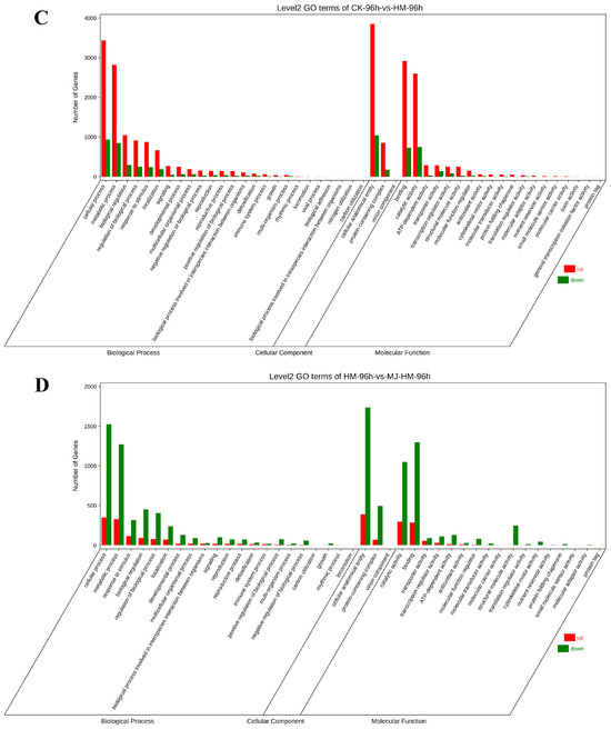 Gene Ontology (GO) analysis of differentially expressed genes (DEGs) in different treatment groups in the epicotyls of maize seedlings. (A) CK-48 h vs. HM-48 h, (B) HM-48 h vs. HM-MJ-48 h, (C) CK-96 h vs. HM-96 h, (D) HM-96 h vs. HM-MJ-96 h. CK (Control), HM (45 mg/L HgCl2), and HM-MJ (45 mg/L HgCl2+75 µmol/L MJ).