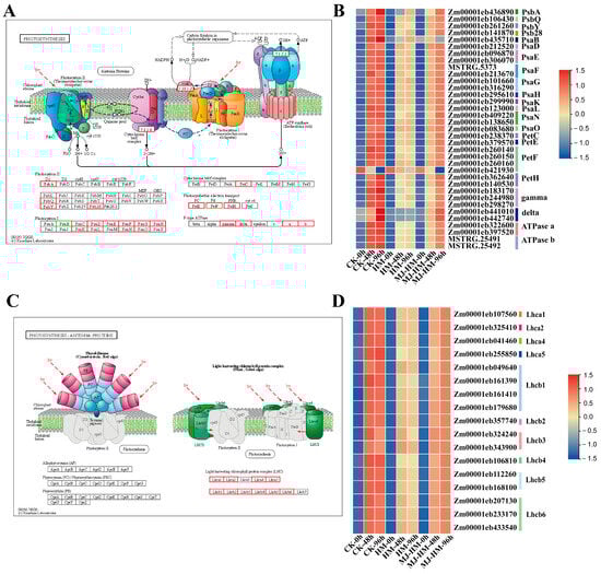 KEGG analysis indicated that genes associated with photosynthetic pathways were significantly affected by Hg exposure and exogenous MJ treatment (HgCl2+MeJA) (Figure 6). After a 96 h treatment period, Hg stress led to the down-regulation of genes encoding light-harvesting chlorophyll proteins, the cytochrome b6/f complex, photosystems I (PSI), photosystems II (PSII), F-type ATP synthase, and components of the photosynthetic electron transport chain, in comparison to the CK (Figure 6). However, when exogenous MJ was applied, these genes were up-regulated under Hg stress (Figure 6B,D). These findings suggest that MJ enhances Hg resistance in maize seedlings by modulating photosynthesis-related pathways.