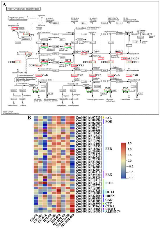Schematic diagrams and heat maps of differentially expressed genes (DEGs) involved in the “phenylpropanoid biosynthesis pathway” in the epicotyls of maize seedlings. (A) The Kyoto Encyclopedia of Genes and Genomes (KEGG) pathway enriched by phenylpropanoid biosynthesis. Red boxes indicate up-regulation of the gene expression coding for the related protein, and green boxes indicate down-regulation. Solid lines represent confirmed research, whereas dotted lines represent areas requiring further research. (B) Heat map showing expression changes in phenylpropanoid biosynthesis. High expression is represented by red, while low expression is shown in blue. CK (Control), HM (45 mg/L HgCl2), and HM-MJ (45 mg/L HgCl2+75 µmol/L MJ).