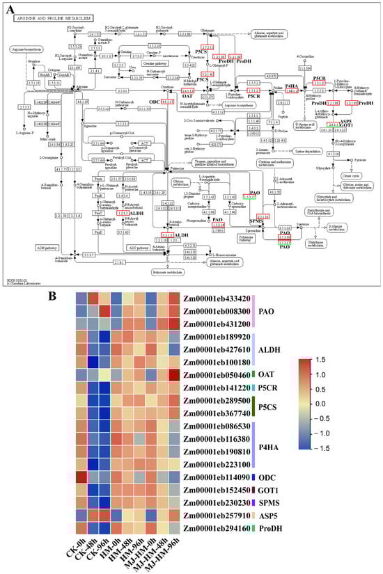 Proline is a crucial stress response compound that assists plants in coping with adverse environmental conditions and sustaining normal growth and development [43]. As shown in Figure 8, the genes encoding polyamine oxidase (PAO), ornithine aminotransferase (OAT), Δ1-pyrroline-5-carboxylic acid reductase (P5CR), Δ1-pyrroline-5-carboxylic acid synthase (P5CS) [42], and aspartate aminotransferase (ASP5) [44], which are involved in proline metabolism of maize seedlings, were significantly up-regulated under Hg stress compared to the CK. Notably, treatment with exogenous MJ enhanced the expression of these genes (Figure 8). Under Hg stress, genes encoding aldehyde dehydrogenase (ALDH) [45], proline-4-hydroxylase (P4HA) [41], ornithine decarboxylase (ODC), glutamic-oxaloacetic transaminase 1 (GOT1) [44], spermidine synthase (SPMS) [46], and proline dehydrogenase (ProDH) [42] were up-regulated compared to the CK. However, in contrast to the treatment with Hg alone, the combination of Hg and MJ significantly down-regulated these genes’ expression levels, particularly at 96 h of treatment (Figure 8B). These findings indicate that MJ enhanced proline levels in maize seedlings under Hg stress by promoting proline biosynthesis and inhibiting proline degradation.