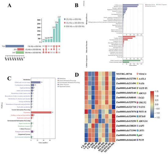 To further understand the alterations in DEGs caused by MJ under Hg stress, we conducted GO and KEGG enrichment analyses, encompassing terms from molecular function (MF), cellular component (CC), and biological process (BP) ontologies. The findings revealed that in the comparison between CK-48 h and HM-48 h, the predominant terms in the biological process category were “cellular process” and “metabolic process”. Furthermore, the categories that showed the highest enrichment included “cellular anatomical entity” in the cellular component and “binding” and “catalytic activity” in molecular function (Figure 4A). In contrast, the comparison of HM-48 h vs. MJ-HM-48 h showed a lack of terms related to “locomotion”, “viral process”, and “nitrogen utilization” (Figure 4B). Additionally, when comparing CK-48 h vs. HM-48 h with CK-96 h vs. HM-96 h, the latter included terms for “detoxification” and “biological adhesion” (Figure 4C). Notably, the number of down-regulated genes in the HM-96 h vs. MJ-HM-96 h comparison exceeded that of the up-regulated genes (Figure 4D). The DEGs identified were significantly associated with the role of MJ in enhancing Hg tolerance. This effect was likely due to the ability of MJ to modify the expression profiles of specific genes that are detrimental to maize seedlings, thereby improving their tolerance to Hg exposure.