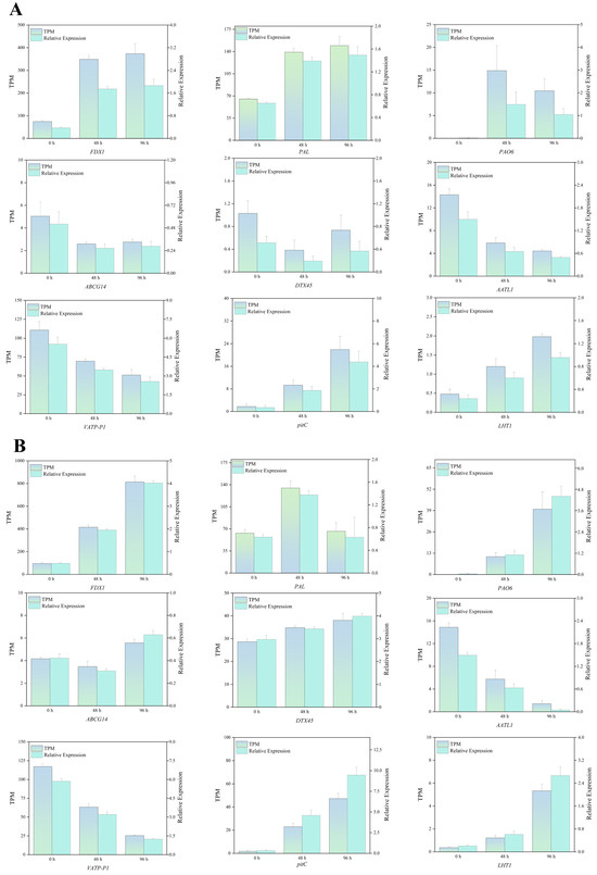 Verification of the RNA-Seq expression profiles of nine genes through qRT-PCR. (A) The expression patterns of the selected nine differentially expressed genes (DEGs) under Hg stress and RNA-seq data. (B) The expression patterns of nine DEGs under Hg+MJ treatment and RNA-seq data. TPM and relative expression levels of the qRT-PCR products from three separate biological replicates are shown in the bar graphs. The relative expression level as determined by qRT-PCR is on the right y-axis; the TPM value as determined by RNA-Seq is on the left.