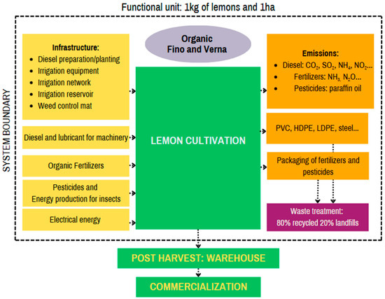 (1) To establish the most representative organic lemon cultivation models in SE Spain, corresponding to the two most common varieties: Fino and Verna. (2) To apply LCC and LCA to the two production models, to evaluate and compare them economically and environmentally with each other and with the conventional lemon cultivation models described and evaluated by García Castellanos et al. [29]. (3) To conduct a sensitivity analysis, assigning variability to non-fresh marketable yields and considering the avoidance of synthetic fertilizers, as these factors have been identified as relevant in the previous analysis.
