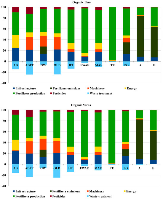 Other limitations of the study are worth highlighting, such as the lack of specific organic fertilizers in the databases, which coincides with the limitations pointed out by other authors [21,61]. Therefore, production was modeled using generic organic fertilizer processes from the Ecoinvent market section, based on their major component (nitrogen, phosphorus, or potassium). Likewise, the technical data sheets for liquid organic fertilizers contain very limited information on the nature and proportion of their constituents. The impacts derived from the cultivation of young plants in a nursery were considered as the Ecoinvent process, corresponding to the cultivation of fruit trees in a nursery.