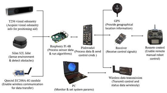 The system is based on the Pixhawk 4 unmanned vehicle platform and uses the Raspberry Pi 4B (Raspberry Pi Foundation, Cambridge, UK) as its onboard computer. We selected this board for its quad-core ARM Cortex A72 processor (1.5 GHz), 4 GB LPDDR4 RAM, and compatibility with Ubuntu 20.04 and ROS Noetic. Its USB 3.0 and gigabit Ethernet interfaces enable high-speed data transfer from LIDAR and visual odometry, while GPIO pins support seamless integration with Pixhawk 4 via UART communication. The system is capable of performing SLAM and path planning based on LIDAR and visual odometry. A hardware block diagram of the system is shown in Figure 1.