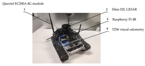 The system integrates Silan S2L LIDAR (SLAMTEC, Pudong New Area, Shanghai, China) and T265 visual odometry (Intel, Santa Clara, CA, USA) for real-time collection of ambient information and mileage data while employing the Quectel EC200A 4G module (QUECTEL, Minhang District, Shanghai, China) to enable IoT communication. The core controller of the system is the Pixhawk 4 (Holybro, Shenzhen, China), which utilizes the MAVROS communication protocol to exchange information with the Raspberry Pi. Additionally, the system is equipped with a RadioLink AT9S (RadioLink, Shenzhen, China) remote controller, allowing for manual control of the unmanned vehicle. The specific parameters of the sensors are shown in Table 1.