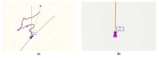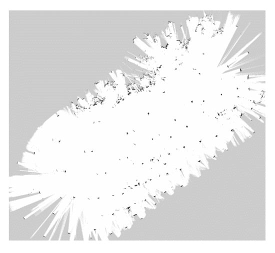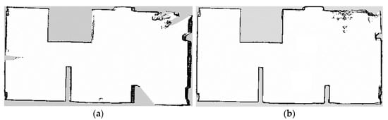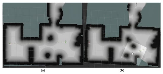 Figure 4a shows the SLAM mapping using only the data of the T265 visual odometry. In the picture, some areas are blurred and irregular. This may be because the visual odometry data are affected by the vibration and lighting during the movement of the unmanned vehicle, and there are noise and errors, resulting in the overlapping and drifting phenomena in the mapping. Figure 4b shows the SLAM mapping using the extended Kalman filter to fuse the odometry data and IMU data. Compared with Figure 4a, the overall mapping is more regular, and these issues are significantly improved. This reflects that after the extended Kalman filter fuses the data of the two sensors, it effectively suppresses the drift of the IMU and improves the accuracy and stability of the mapping.