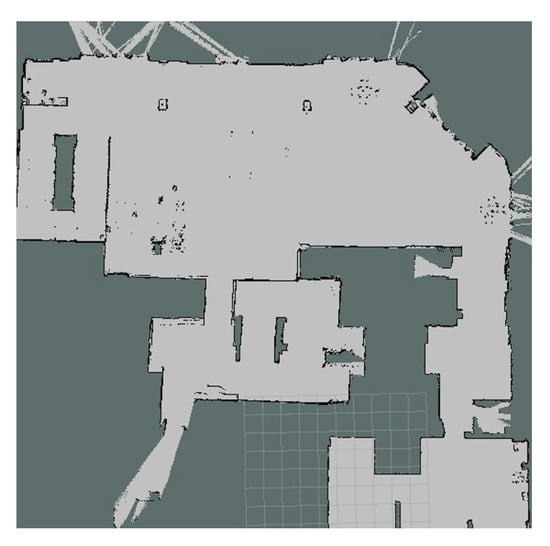 The unmanned vehicle utilizes the Karto algorithm for large-scale mapping, which offers the advantage of low resource consumption []. The Karto algorithm requires inputs from a LIDAR and odometry data. However, the T265 visual odometry may produce inaccurate data in low-light conditions or when the device experiences shaking. To address this problem, this design utilizes the “robot_pose_ekf package” to fuse the T265 visual odometry data with IMU data from the Pixhawk 4 using an EKF, and outputs the fused data on the “odom” topic. This approach combines the strengths of both sensors to enhance the accuracy and robustness of the vehicle’s pose estimation.