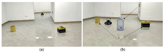 Placement of obstacles in the experimental environment: (a) existing obstacles; (b) temporary obstacles. 1. Fixed obstacles; 2. Temporary obstacle.