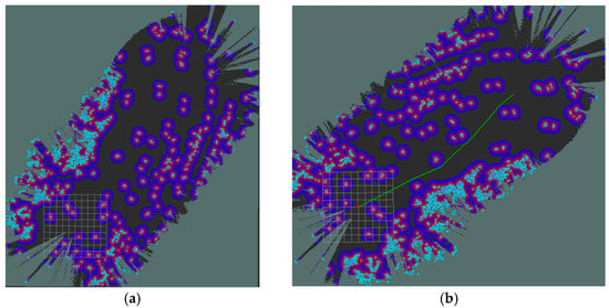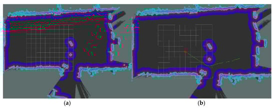 After completing the mapping of the surrounding environment, the map is saved to the Raspberry Pi. The cost_map creates a costmap by loading a saved map file. Figure 6a shows the costmap created. The costmap is displayed in Rviz, and a 2D goal is set to define the target position for the unmanned vehicle. The adaptive Monte Carlo localization (AMCL) algorithm is used to estimate and update the position of the unmanned vehicle by performing probabilistic inference based on the vehicle’s motion and perception information. Once “move_base” receives the target position, it performs global path planning using the Dijkstra algorithm. After generating the global path, “move_base” employs a local path planning algorithm to generate a smooth local path near the robot’s current position. The local path planning algorithm usually takes into account the robot’s kinetic model and sensor information to ensure safe obstacle avoidance and movement along the global path. Once both the global and local paths are generated, “move_base” converts the local path into linear and angular velocity commands and sends them to the Pixhawk 4 via the “cmd_vel” topic. The ArduPilot firmware receives the linear and angular velocity data and controls the left and right motors to execute the path planning for the unmanned vehicle, as shown in Figure 6b. The green line in the figure represents the local path generated by the local path planning algorithm in “move_base”.