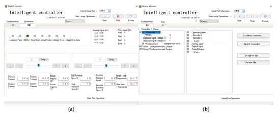 In this study, Motor Monitor version 1.0 (KEYA ELECTRON, Jinan, China) software was utilized to monitor the status and configure parameters of the servo controller. Figure 11a illustrates the main interface of the Motor Monitor software and the operational status of the servo controller. The servo controller offers four control modes: independent mode, hybrid mode 1, hybrid mode 2, and hybrid mode 3. Initially, the unmanned sprayer vehicle employed hybrid mode 1, where the steering and throttle were controlled through two signal lines, enabling remote control of the tracked vehicle’s movement using a remote controller. In this study, by adjusting the steering and throttle signals output by the ArduPilot, the remote controller was able to control the movement of the unmanned sprayer vehicle. However, the motion of the tracked vehicle could not be controlled through linear velocity and angular velocity signals. To address this problem, the control mode of the servo controller was changed to independent mode in this study, with the input being the signals from the two motors, as shown in Figure 11b.