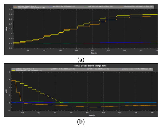 This study considered the differences in mass and inertia between the tracked chassis and the model vehicle chassis. It analyzed the potential oscillations or overshooting that may occur during turning or speed changes of the unmanned sprayer vehicle. To address this, a method based on a PID controller with derivative parameter adjustment was proposed. The derivative parameter adjusts the control input based on the rate of change in system state, enhancing the control system’s responsiveness to state variations. By optimizing the values of the derivative parameters, this study effectively suppressed the oscillations and overshooting of the unmanned sprayer vehicle, improving its stability and control accuracy during operation. Figure 12a illustrates the PID curve of the unmanned sprayer vehicle during acceleration, where the x-axis represents the system’s operating time and the y-axis represents the speed. The curve shows a stable and orderly upward trend during the acceleration phase. Figure 12b displays the PID curve of the unmanned sprayer vehicle during deceleration, with the x-axis representing the system’s operating time and the y-axis representing the speed. The curve demonstrates a smooth downward trend during the deceleration phase until the speed reaches zero. These results indicate that by adjusting the derivative parameters, smooth control during acceleration and deceleration of the unmanned sprayer vehicle was achieved, effectively enhancing overall stability and control accuracy during its operation.