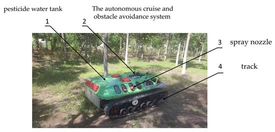 The system modified the Tianyi 3WDZ–200D (Nonggu Feinong Plant Protection Technology Co., Ltd., Jinzhong, China) autonomous remote-controlled power sprayer, which is a remote-controlled tracked robot specifically designed for fruit tree plant protection. It is equipped with a 200 L pesticide water tank and incorporates fine-misting technology, capable of controlling the spray particle size within 100 μm and achieving a spraying range of 6–8 m, ensuring a more uniform coverage of the orchard with pesticides while saving water and reducing pesticide consumption by approximately 30%. The nozzles can be manually adjusted according to the operational environment (such as tree row spacing and height) to ensure targeted and comprehensive coverage, thereby enhancing the effectiveness of plant protection. It possesses remarkable adaptability and can operate flexibly in various terrains and orchard environments. Its tracked chassis and low bodywork enable it to rotate in place and maneuver between fruit trees.