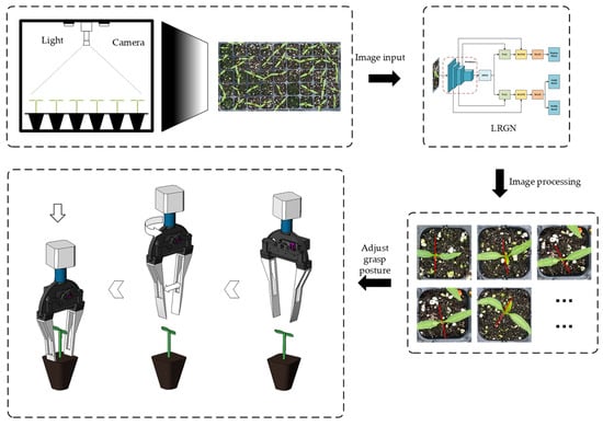 In this paper, a low-damage grasp method for plug seedlings is proposed, and its overall process is shown in Figure 2. Firstly, the 2D image of the whole tray of plug seedlings is captured in a light box to ensure that high-quality image data are obtained under uniform light conditions. Then, according to the size of the plug-hole, each plug seedling is segmented from the overall image and input into the designed lightweight low-loss grasping model LRGN, which automatically calculates the optimal grasping position of each plug seedling based on the input image, including key parameters such as grasp point, grasp angle, and grasp width. Finally, the system transmits the generated optimal grasp position information to an end-effector with two degrees of freedom, which performs a low-damage grasp operation according to the position to ensure that damage to the seedling is minimized during the grasp process.