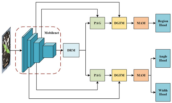 As shown in Figure 5, LRGN can be roughly divided into two parts: encoder and decoder. The encoder consists mainly of Mobilenet, DRM, PAG, DGFM, and MAM; the decoder consists of prediction output head, namely region head; angle head; and width head, which are responsible for decoding the grasping features extracted by the encoder into a heat map grasping representation.