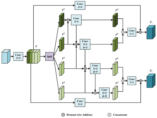 First, a 3 × 3 convolution is used to adjust the number of channels of the input features to 1024. This results in feature F, which is then used to extract deep features. Then, F is divided into four sets of feature mappings {F1, F2, F3, F4} equally along the channel dimension. Next, a multiscale feature fusion method is employed to incorporate neighboring branch features at the pixel level. These features are then fed into various types of convolutional blocks to extract contextual features. The particular operation can be represented as Equation (5):