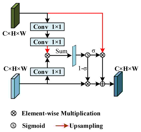 PAG is a module for fusing P-branching and I-branching in PIDNet [14], and its simplified structure is shown in Figure 7. This module enables shallow features to selectively learn useful semantic information from deep features. Defining the vectors of corresponding pixels in the shallow feature map and deep feature map, respectively, the output of the sigmoid function can be expressed as Equation (6):