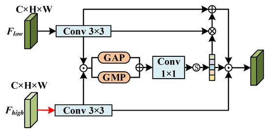 As shown in Figure 8, the DGFM utilizes a deep feature map and a shallow feature map as inputs. The size of is adjusted to match through upsampling. By utilizing a 3 × 3 convolution, the feature map is enhanced by increasing the number of channels to 256, resulting in a more enriched feature representation. The convolved deep feature and shallow feature can be represented as (8) and (9):