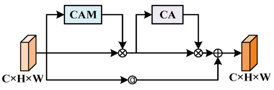 where and are the input and output features of the MAM, CA(∙) denotes the channel attention module, CAM(∙) denotes the coordinate attention module, denotes the pixel-level multiplication, and is the adaptive weights with an initial value of 1.0 and adaptively adjusts the weights during the training process.