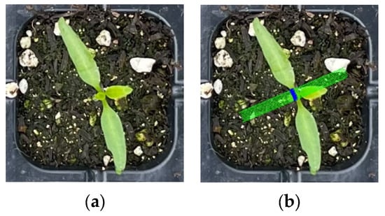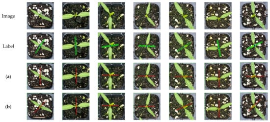 The captured images of plug seedlings were segmented and scaled according to the size of the plug-hole to obtain 852 images with a resolution of 350 × 350 to construct the grasp dataset of plug seedings, as shown in Figure 12a. The images were divided into training set and validation set in the ratio of 8:2, each image was labeled with the pixel-level grasp position using the literature method, and the principles of labeling were as follows: the grasp point was as close as possible to the center of the plug seedling, the direction of the grasp angle was perpendicular to the direction of the line connecting the two leaves, and the landing point of the clamping claw was as far away from the edge of the plug-hole as possible. The label is visualized as shown in Figure 12b.
