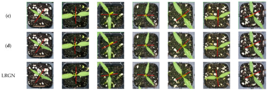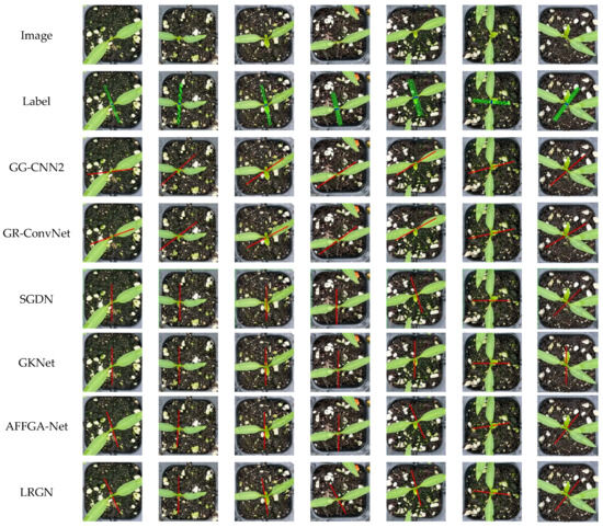 Some of the test results for LRNG and other networks on the grasp dataset of plug seedings are visualized in Figure 13. The red line represents the predicted optimal grasp position of the end effector. It can be seen that the grasp position detected by LRNG can better localize the seedling cores, and the landing point of its end- effector can avoid the seedling body and the edge of the plug-hole grid, thus achieving low-damage grasp. However, for seedlings that are particularly close to the edge of the plug-hole, the grasp position detected by the algorithm shows some limitations in balancing the avoidance of seedlings and avoidance of the edge of the plug-hole. When the seedling center is within 15 pixels of the hole edge, grasp detection accuracy drops by 3.2% on average compared to center positions. This decline is attributed to the increased background complexity and overlapping morphology near the edge.