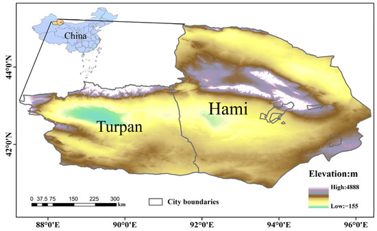 The Turpan–Hami Basin, located in eastern Xinjiang, China (87°16′–96°23′ E, 40°52′–45°05′ N), encompasses the administrative regions of Turpan and Hami (Figure 1), covering approximately 12.6% of Xinjiang’s total land area. This intermontane fault-depression basin features relatively flat terrain surrounded by mountains, with the lowest elevation reaching –155 m below sea level [35]. Characterized by a continental arid climate, the region receives over 3200 h of sunshine annually, with pronounced diurnal temperature variations and intense solar radiation. However, it suffers from minimal precipitation, high evaporation, frequent extreme weather events, and severe ecological fragility. Water resources are extremely limited, heavily reliant on snowmelt and overexploited groundwater [36]. Despite these constraints, the basin supports rich agricultural activity, primarily favoring drought-tolerant crops. Turpan is renowned for its grape production, while Hami is famous for melons and other fruits. Cotton and maize are also cultivated, mostly along riverbanks and oasis fringes where human activity is concentrated [37]. In addition, the basin is a significant hub for oil, coal, and mineral extraction in Xinjiang, with emerging agro-processing industries such as winemaking and an increasing integration of agriculture with tourism.
