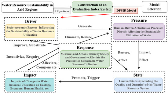 In response to the growing pressure exerted by socio-economic development on water resources in arid regions, this study constructs a DPSIR model to evaluate their sustainability (Figure 2). The DPSIR framework consists of five subsystems: Driver (D)—indicators reflecting socio-economic factors that drive changes in water resources; Pressure (P)—indicators describing the demand for and stress on water resources resulting from economic activities; State (S)—indicators representing the current condition of water resources, including their quantity and quality; Impact (I)—indicators illustrating the effects of water resource conditions on the socio-economic system and ecological environment; and Response (R)—indicators describing societal and ecosystem feedback and adaptation in response to human activities.
