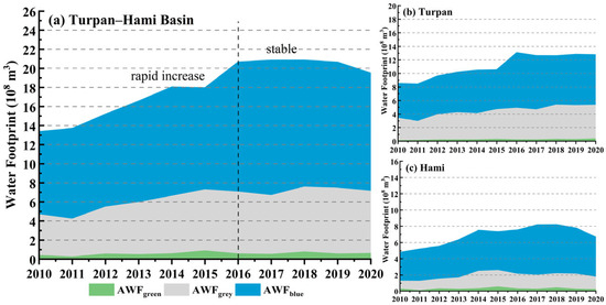 Figure 3a illustrates that the AWF in the Turpan–Hami Basin showed a generally increasing trend, with fluctuations from 2010 to 2020, rising from 1.34 billion m3 in 2010 to a peak of 2.09 billion m3 in 2018, followed by a slight decrease to 1.95 billion m3 in 2020. The cultivated area of crops and the amount of nitrogen fertilizer applied in the study area have decreased, resulting in a slight reduction in the total WF. Among the components, the blue WF consistently accounted for more than 60% of the total (Figure 4), underscoring the region’s heavy reliance on irrigation. The proportion of blue water in Hami (72.1%) is higher than that in Turpan (59.9%). The grey WF also exhibited an upward trend, growing from 4.28 × 108 m3 in 2010 to 6.88 × 108 m3 in 2019, comprising roughly 32% of the total, which indicates considerable pressure from non-point source agricultural pollution on regional water resources. In contrast, the green WF remained consistently low, contributing less than 5% annually and fluctuating between 0.25 × 108 m3 and 0.88 × 108 m3. This reflects the limited role of natural precipitation and highlights the dependence on irrigated agriculture in the region.