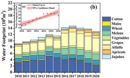 (a) Trends in the water footprint and (b) crop water footprint in the Turpan–Hami Basin.