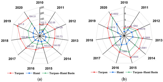 In this study, the water scarcity index is defined as the ratio of the agricultural WF to available local water resources. An index above 100% indicates agricultural water demand exceeds renewable supply, signaling unsustainable use. This often leads to over-extraction of surface and groundwater and reallocation of ecological flows to agriculture, potentially causing long-term resource depletion and ecological damage. The WF of economic crops in the Turpan–Hami Basin has risen markedly, becoming the main contributor to the increasing AWF. However, this increase in water use has not been matched by improvements in water availability. Instead, water scarcity across the basin has intensified (Figure 6a), underscoring the escalating conflict between agricultural water demand and the region’s water resource carrying capacity. This issue is especially acute in Turpan, where the agricultural water scarcity index jumped from 102.3% in 2010 to 184.5% in 2020, reflecting a prolonged period of overexploitation. This implies that agricultural water use in Turpan heavily depends on groundwater overdraft or the reallocation of ecological water flows. In contrast, Hami has experienced a comparatively lower yet steadily rising level of water scarcity, with the index increasing from 28.9% in 2010 to 81.9% in 2020. For the basin as a whole, the index rose from 53.4% to 128.95% over the same period, signaling a growing threat of unsustainable agricultural water use throughout the region.