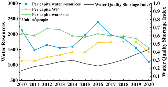 Per capita water resources, water footprint, water consumption (m3/people), and water quality shortage index in the Turpan–Hami Basin.