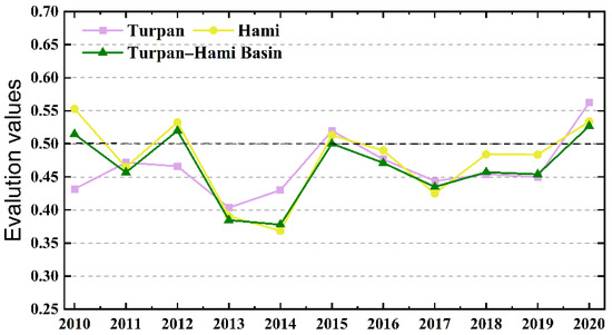 The multi-indicator evaluation of agricultural water resource sustainability reveals that the Turpan–Hami Basin frequently hovers on the boundary between sustainable and unsustainable states, reflecting considerable system vulnerability. Although the sustainability score showed improvement in 2020—indicating some progress in water conditions—the foundation for this improvement remains fragile, and substantial challenges persist. Compared with the national-level DPSIR assessment conducted by Zhang et al., the overall sustainability of water systems in northwestern China remains relatively low, despite gradual signs of improvement. The complex nonlinear interactions they identified are consistent with the sustainability patterns observed in this study [65].