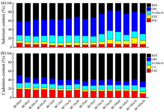 (a) Soil Se patterns in each treatment; (b) Soil Cd patterns in each treatment. SOL denotes Se in the water-soluble state; EXC denotes Se and Cd in the exchangeable state; CA denotes Cd in the carbonate-bound state; Fe-Mn-O denotes Se and Cd in the iron-manganese oxide-bound state; OM denotes Se and Cd in the organic-bound state; and RES denotes Se and Cd in the residue state.