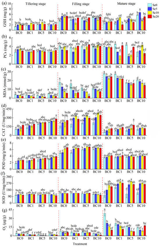 The results in Figure 2 show the changes in the antioxidant contents of rice leaves during various periods. The results revealed that both B-SeNPs spraying and biochar addition increased the contents of GSH, PCs, CAT, POD, and SOD and decreased the contents of MDA and O2− in rice leaves. From the tillering stage to the filling stage, B-SeNPs spraying increased the GSH content of rice leaves by 2.73 to 3.47 mg/g when no biochar was applied, but it decreased it by 1.75 to 2.25 mg/g from the filling stage to maturity; when only biochar was applied, the GSH content of the leaves at the filling stage increased by 2.19 to 3.21 mg/g compared with that at the tillering stage but decreased at the mature stage by −0.90 to 1.67 mg/g, whereas the GSH content increased by 0.11 to 2.75 mg/g from the tillering stage to the filling stage and by −2.57 to 2.23 mg/g at the mature stage when the two agents were combined (Figure 2a). The application of biochar and B-SeNPs promoted the production of PCs in rice leaves, but the addition of biochar did not have a significant effect on the PC content under Se-free conditions before maturity; the opposite was true with Se application (without biochar), and the effect was greater at the Se10 level than at the Se5 and Se20 levels (Figure 2b). At maturity, the PC content was significantly lower in the Se5 and Se10 treatments than in the other treatments under biochar addition (p < 0.05, except for BC10Se10). Compared with the BC0Se0 treatment, spraying B-SeNPs alone increased the PC content by −0.36 to 0.10 mg/g, biochar alone increased the PC content by −0.46 to 0.06 mg/g, and combined application increased the PC content by −0.96 to 0.22 mg/g.