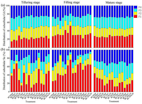 Both the addition of biochar and the spraying of B-SeNPs increased the percentage of Cd in the cell wall and decreased the percentage of Cd in the chloroplast, mitochondrial, and soluble fractions (Figure 3a). At the tillering stage, compared with that of the control (BC0Se0), the percentage of Cd in the cell wall fractions increased by 2.32% to 14.20%, and the percentages of the chloroplast, mitochondrial, and soluble fractions of Cd decreased by 1.23% to 7.17%, −1.50% to 2.46%, and −1.72% to 5.39%, respectively, at the BC0 level, whereas at the Se0 level, the percentage of the Cd fractions in the cell wall increased by 5.48% to 11.18%, and the percentages of the chloroplast, mitochondrial and soluble fractions decreased by 1.75% to 10.18%, −4.00% to 4.45%, and −0.71% to 6.66%, respectively. The combined application of biochar and B-SeNPs increased the percentage of Cd in the cell wall by 4.48% to 13.35%, and the percentages of Cd in the chloroplast, mitochondrial, and soluble fractions decreased by 0.33% to 3.99%, −1.03% to 4.38%, and 1.46% to 5.00%, respectively. At the filling stage, the trend in the Cd content ratio was the same as that at the tillering stage, except that the percentage of Cd in the mitochondrial fractions in the BC10 level treatments increased by 4.08 to 6.19%, and the percentage of Cd in the soluble fractions in the BC0 level treatments increased by 0.81 to 9.33%. However, at maturity, compared with those in the BC0Se0 treatment, the proportions of Cd (3.24% to 7.69%) in the mitochondrial fractions in all treatments and soluble fractions (0.19% to 1.28%) in the BC5 level treatments increased, and the proportion of Cd in the chloroplast fractions decreased by 1.32% to 13.49% in all the treatments.