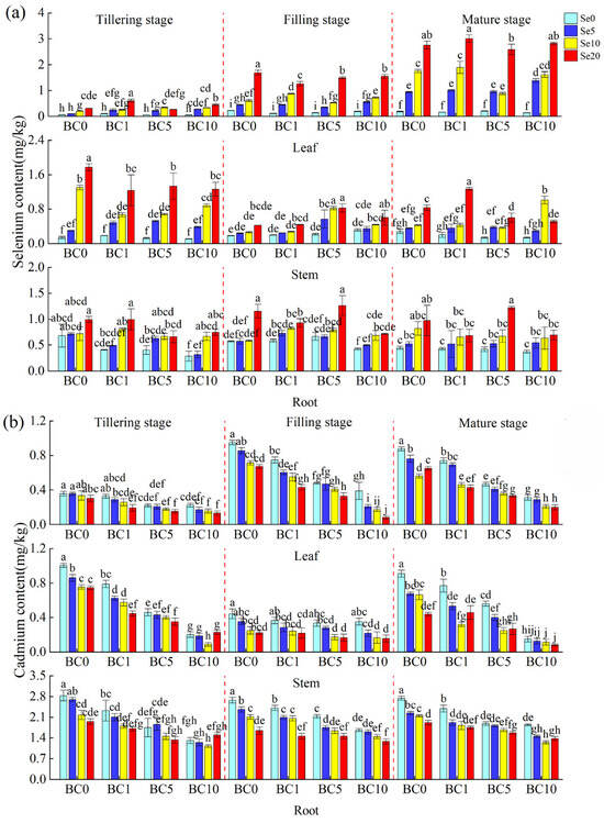 Figure 4 shows that the combined application of biochar and B-SeNPs significantly increased the Se content and reduced the Cd content of rice roots, stems, and leaves, and the effect was greater than that of biochar alone or B-SeNPs alone. The greater the amount of Se applied, the greater the Se content of the roots, and the overall effect of the combined application was in the order of BC5 > BC1 > BC0 > BC10, with the BC5Se20 treatment showing the best effect. Rice stems presented a relatively high Se content at the tillering stage and a relatively low Se content at the mature stage, whereas the opposite trend was observed in the leaves. At the same biochar application level, the Se content of rice roots sprayed with B-SeNPs increased by 0.08 to 0.53 mg/kg (BC0), 0.09 to 0.25 mg/kg (BC1), 0.11 to 0.80 mg/kg (BC5), and 0.17 to 0.32 mg/kg (BC10); the Se content of stems increased by 0.07 to 0.55 mg/kg (BC0), 0.16 to 1.07 mg/kg (BC1), 0.23 to 0.46 mg/kg (BC5), and 0.15 to 0.87 mg/kg (BC10); the Se content of leaves increased by 0.76 to 2.57 mg/kg (BC0), 0.85 to 2.85 mg/kg (BC1), 0.68 to 2.38 mg/kg (BC5), and 1.25 to 2.69 mg/kg (BC10), compared with Se0 (Figure 4a).