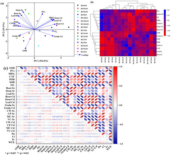 The correlation analysis between the variables. (a) Principal component analysis; (b) Pearson correlation matrix analysis; (c) relationship between Se and Cd content and physio-biochemical indices in rice. CW-Se: Se in cell wall fractions; CP-Se: Se in chloroplast fractions; MC-Se: Se in mitochondrial fractions; VC-Se: Se in soluble fractions. Cd, similarly.