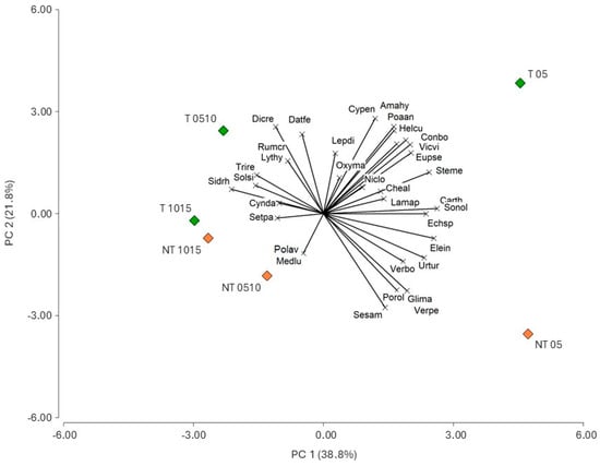 Principal Components Analysis (PCA) of species abundance data from the seedbank during 2022. Treatment codes: T, green symbols for occasional tillage, NT, orange symbols for no-till, and 05, 510, and 1015 for the three studied depths (0–5, 5–10 and 10–15 cm, respectively). The vectors represent weed species, labeled with the first three letters of the genus and the first two letters of the species.
