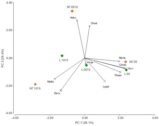 Principal Components Analysis (PCA) of species abundance data from the seedbank during 2023. Treatment codes: L, green symbols for occasional tillage, NT, orange symbols for no-till, and 05, 510, and 1015 for the three studied depths (0–5, 5–10 and 10–15 cm, respectively). The vectors represent weed species, labeled with the first three letters of the genus and the first two letters of the species.