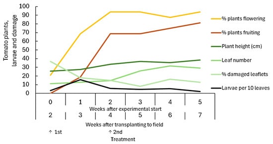 - Ndereyimana, A.; Nyalala, S.; Murerwa, P.; Gaidashova, S. Field Efficacy of Entomopathogens and Plant Extracts on Tuta absoluta Meyrick (Lepidoptera: Gelechiidae) Infesting Tomato in Rwanda. Crop Prot. 2020, 134, 105183. [Google Scholar] [CrossRef]