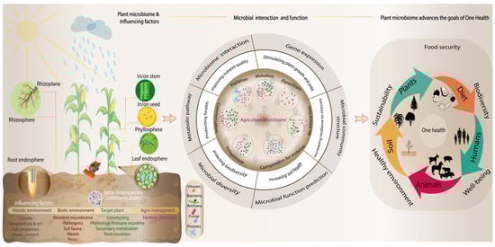 In response, sustainable agricultural practices have emerged as an urgent priority, with microbiome-based innovations offering promising strategies to enhance plant health, mitigate disease, and optimize agricultural resilience [9]. Central to these efforts is the One Health framework [10], which emphasizes the inextricable linkages among human, animal, and environmental health. Within this paradigm, agricultural microbiomes play a pivotal role in co-regulating ecological balance, evolutionary adaptation, and systemic stability. Often overlooked, the complex interactions among soil microbial communities significantly contribute to improved soil health, crop productivity, and ecosystem sustainability (Figure 1). Understanding the intricate mechanisms that underpin plant growth and resilience in the face of these challenges requires a closer look at the soil environment. Plant development is strongly influenced by soil fertility and various microbial interactions that facilitate the solubilization and mobilization of essential nutrients such as phosphorus and nitrogen [11]. The soil microbiome is increasingly recognized as a crucial foundation for ecosystem resilience and functioning, mediating biogeochemical cycles. For example, microbes enhance soil fertility through their role in biogeochemical cycles [12] and contribute to elevated carbon storage in soils with higher plant diversity [13]. Microbial activity, including that of rhizosphere fungi, also impacts soil hydrophobicity and hydraulic function, highlighting the far-reaching consequences of these communities [14,15]. Thus, thriving soil microbial communities are a vital component of the success of regenerative agriculture practices.