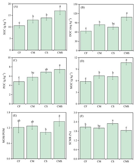Effects of different fertilization treatments on the soil organic carbon (SOC) (A), dissolved organic carbon (DOC) (B), particulate organic carbon (POC) (C), mineral-associated organic carbon (MOC) (D), MOC-to POC ratio (MOC/POC) (E), and SOC mineralization rate (SCMR) (F). Different lowercase letters indicate significant differences between treatments (p < 0.05). The error line shows the standard deviation of the three repeated measurements. CF, CM, CS, and CMS indicate chemical fertilizer, manure combined with chemical fertilizer, straw returning combined with chemical fertilizer, and straw returning combined with manure and chemical fertilizer.