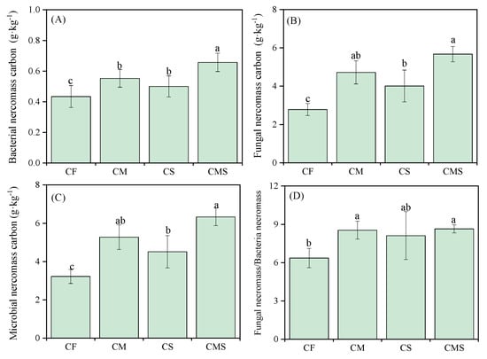 Effects of different fertilization treatments on the soil bacterial necromass carbon (A), fungal necromass carbon (B), microbial necromass carbon (C) contents, and fungal necromass-to-bacterial necromass carbon ratio (D). Different lowercase letters indicate significant differences between treatments (p < 0.05). The error line shows the standard deviation of the three repeated measurements. CF, CM, CS, and CMS indicate chemical fertilizer, manure combined with chemical fertilizer, straw returning combined with chemical fertilizer, and straw returning combined with manure and chemical fertilizer.