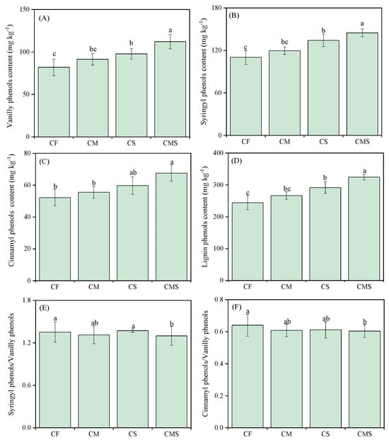 Effects of different fertilization treatments on the soil vanilly phenols (A), syringyl phenols (B), and cinnamyl phenols (C), lignin phenols (D) contents, syringyl phenols-to-vanilly phenols ratio (E), and cinnamyl phenols-to- vanilly phenols ratio (F). Different lowercase letters indicate significant differences between treatments (p < 0.05). The error line shows the standard deviation of the three repeated measurements. CF, CM, CS, and CMS indicate chemical fertilizer, manure combined with chemical fertilizer, straw returning combined with chemical fertilizer, and straw returning combined with manure and chemical fertilizer.